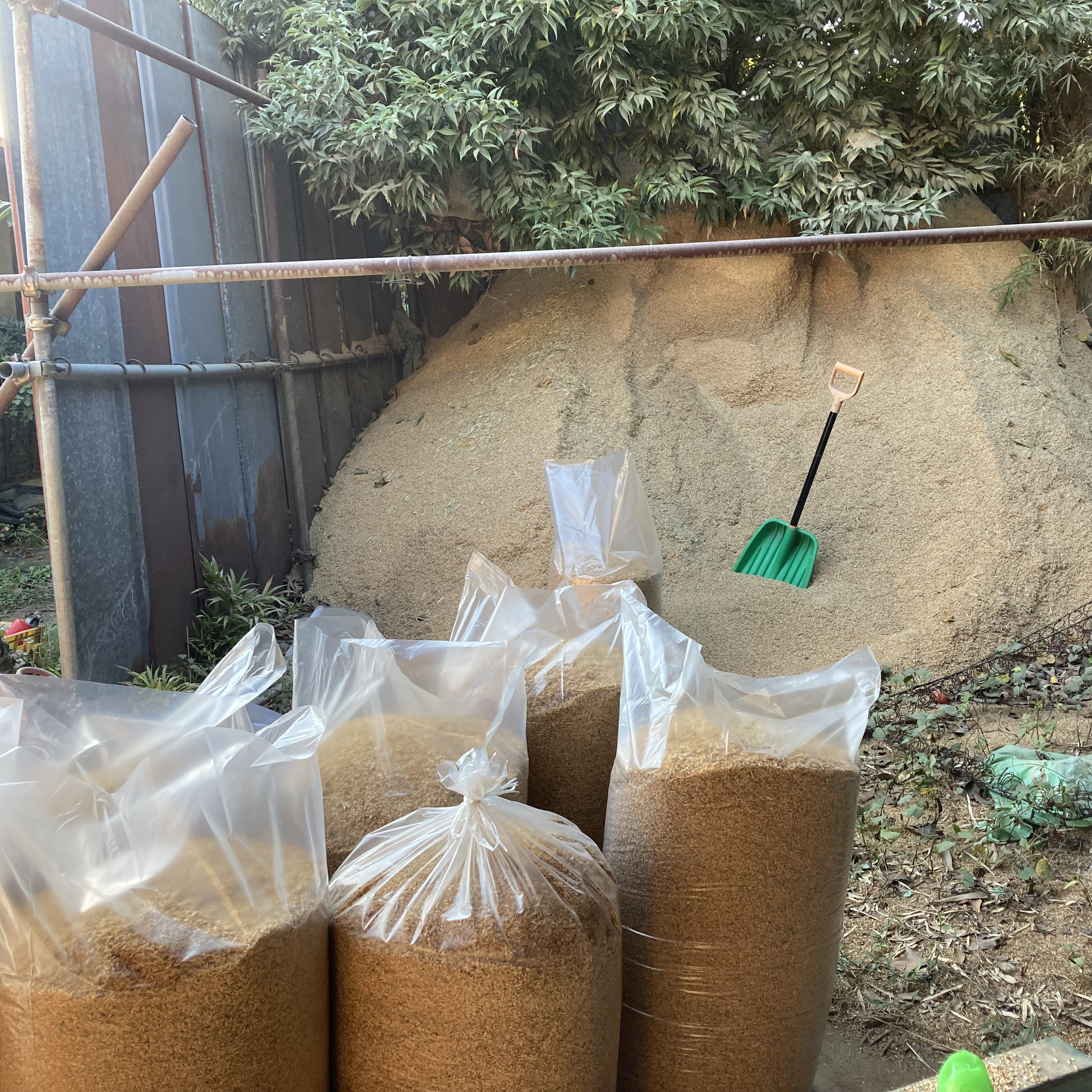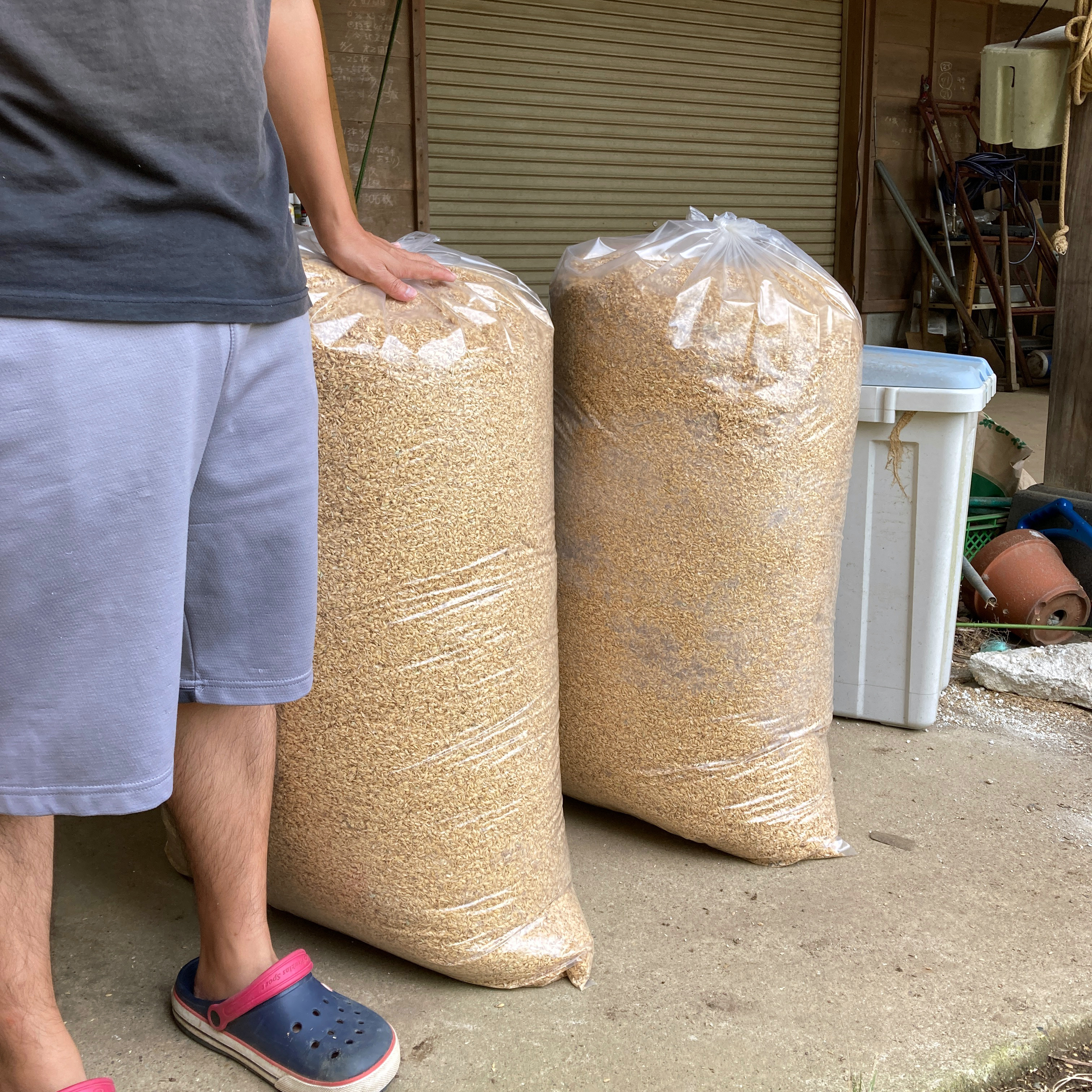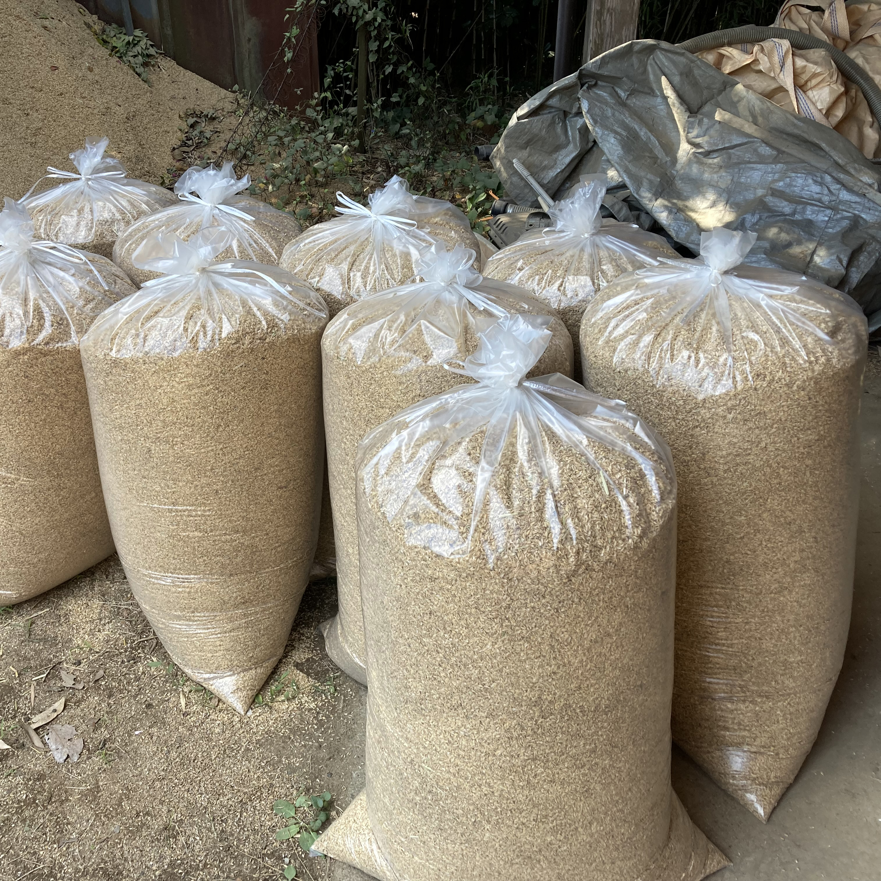 Unlike many farmers who burn rice husks soon after harvest, we keep ours available year-round. However, since they are generally stored outdoors, the husks may be slightly damp, and sometimes leaves from nearby trees may be mixed in. We try to provide drier husks whenever possible, but if you absolutely require completely dry material, please check in advance.